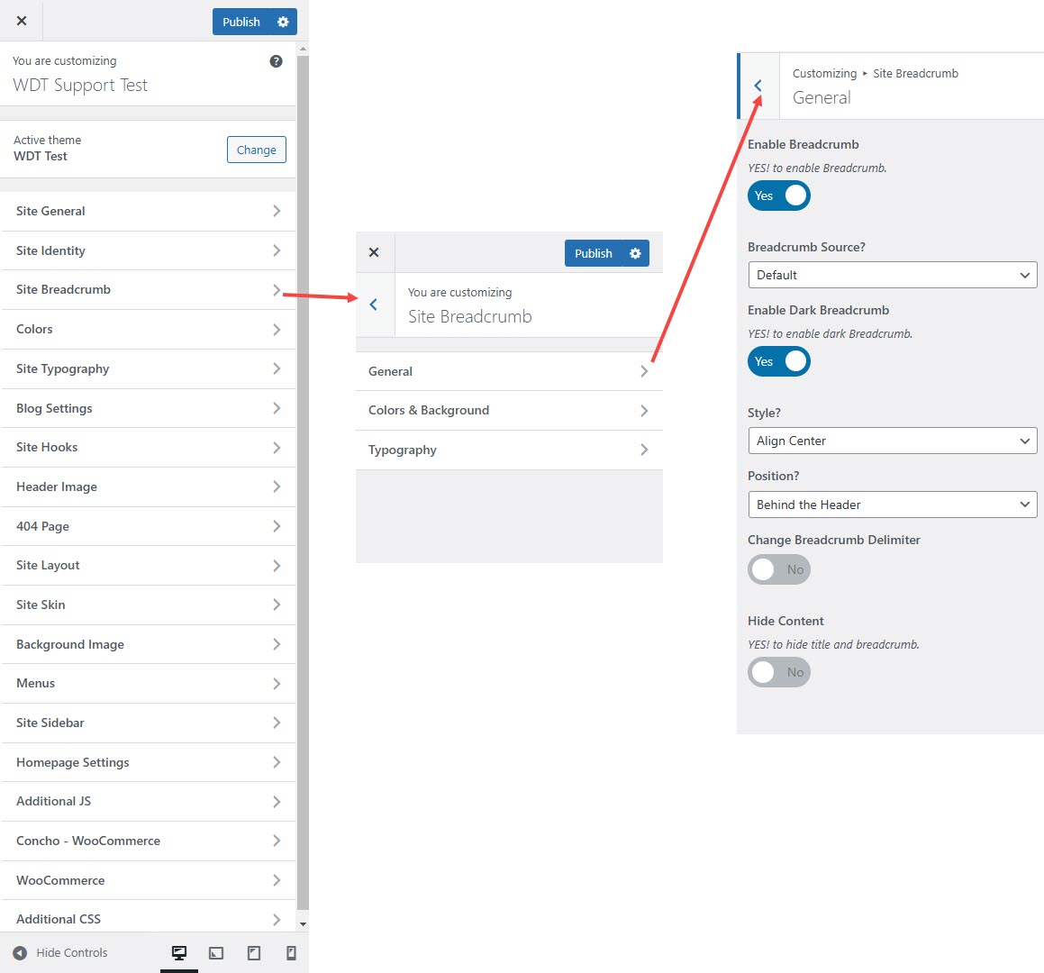 * Go to **Appearance** → **Customize** → **Site Breadcrumb** → **General Options**.