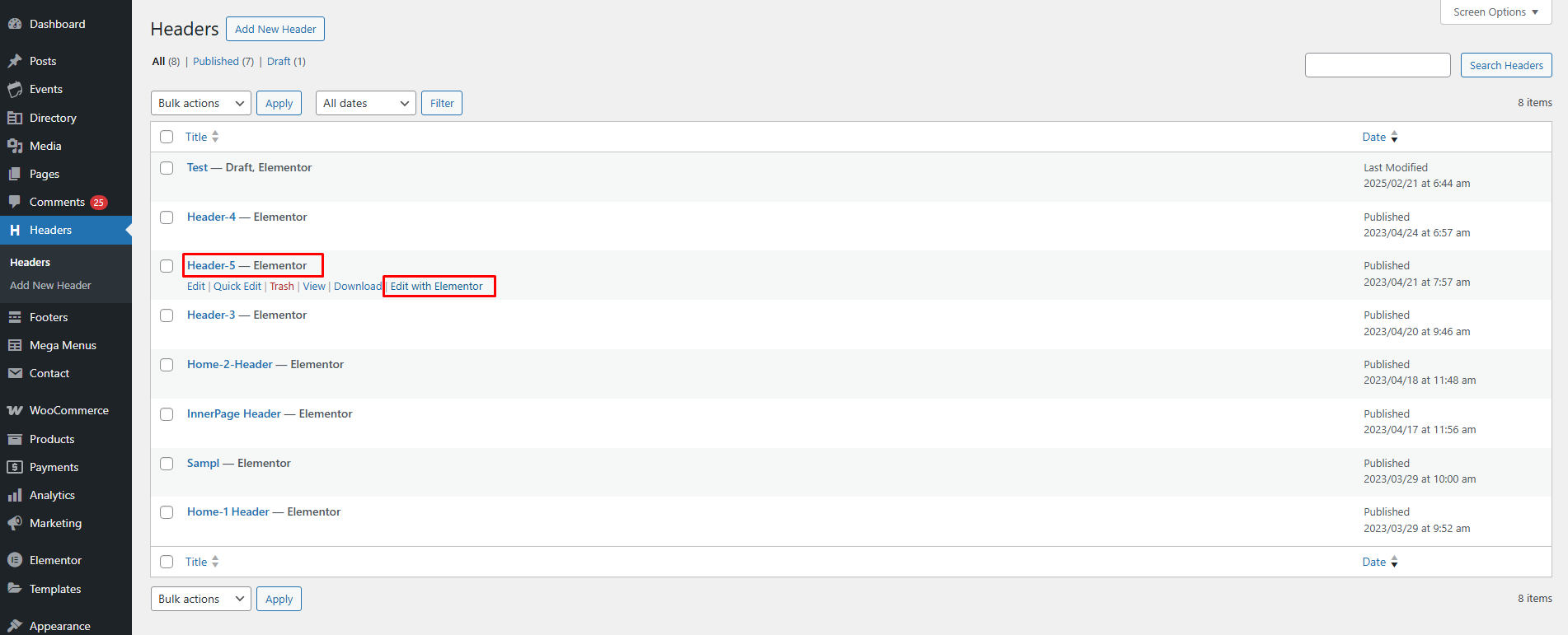 * Go to **WordPress Dashboard > Header**, select the header, and click **Edit with Elementor**