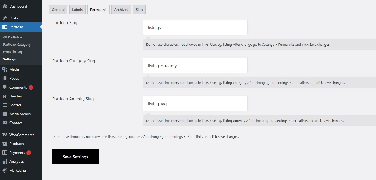 * **Portfolio Slug**: Change "listings" to a preferred term.