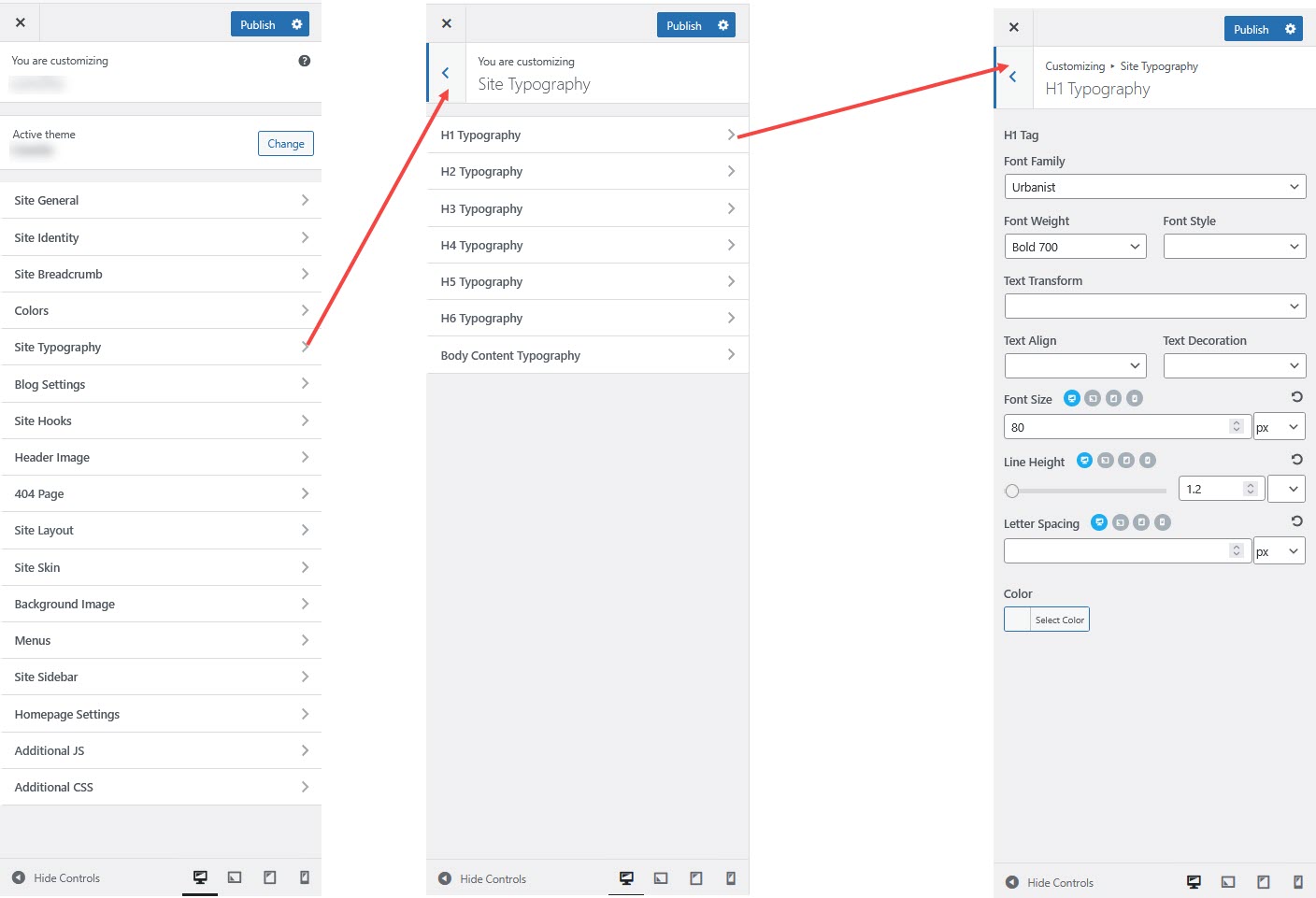 **H1 Typography  :** Adjust the font family, size, weight, line height, letter spacing, and text transform for H1 headings.