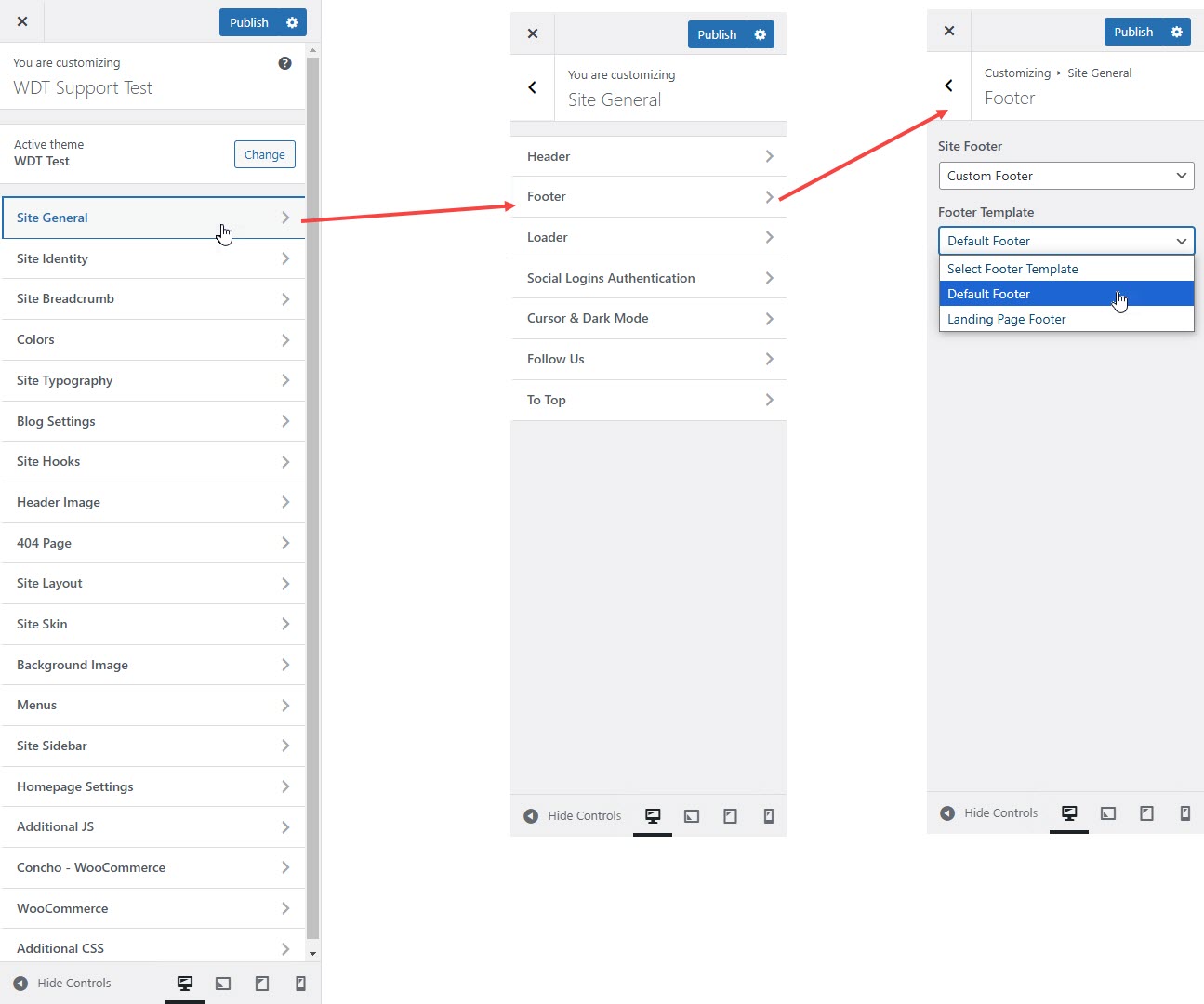 * Navigate to **Appearance** → **Customize** → **Site General** → **Footer**.
