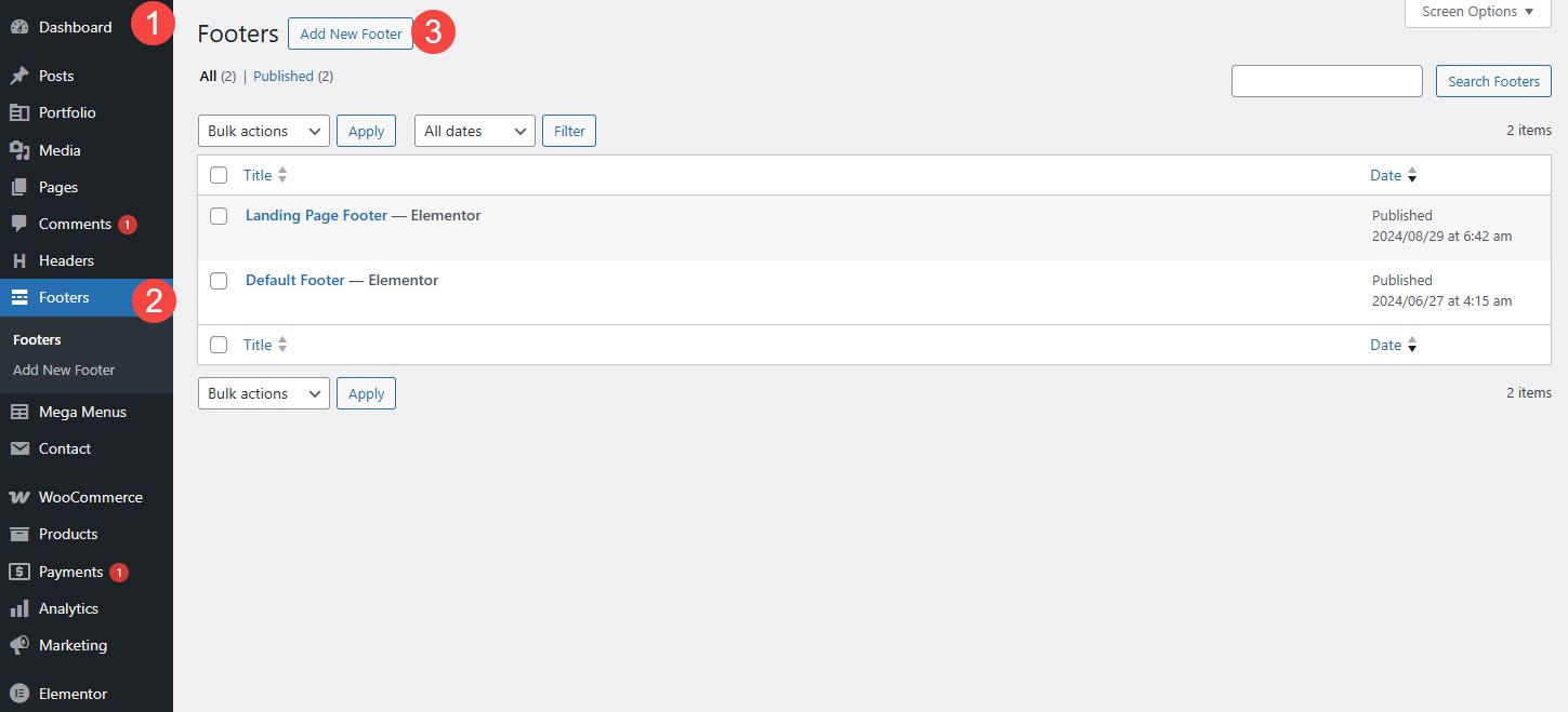 * Go to **WordPress Dashboard** → **Footer** → **New Footer** .