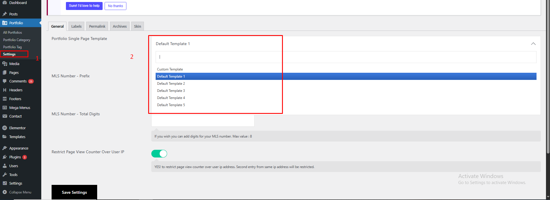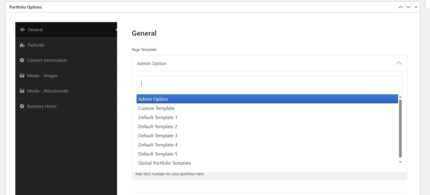 * If you select **"Admin Option"**, the system will use the template set under: **Dashboard -> Portfolio → Settings → General (tab) → Portfolio Single Page Template**