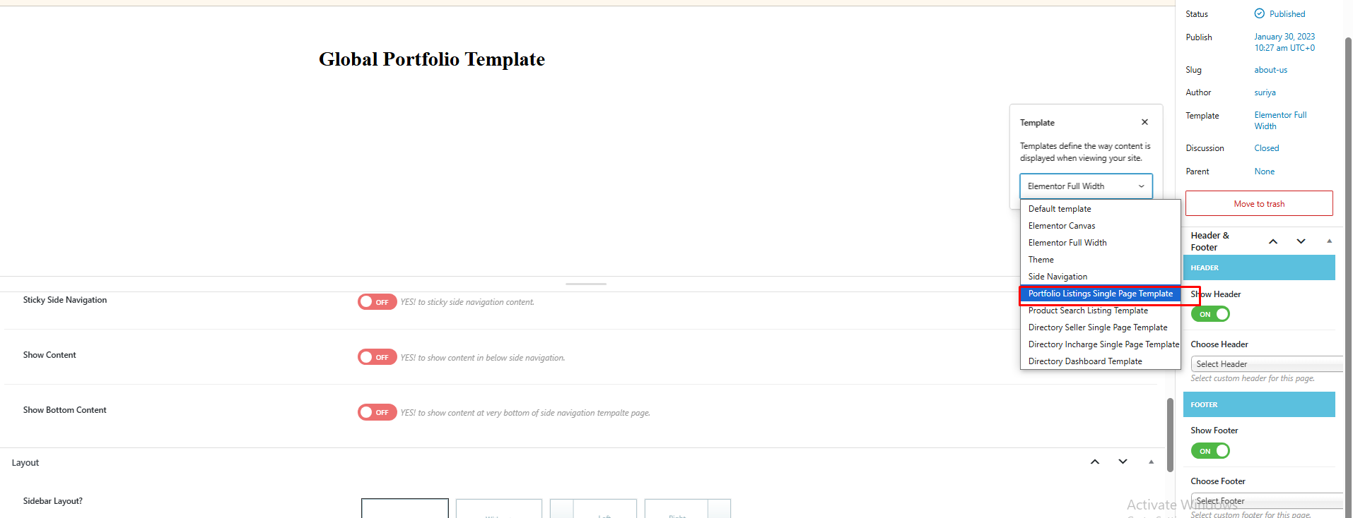 2. Assign the page template: **“Portfolio Listing Single Page Template”**